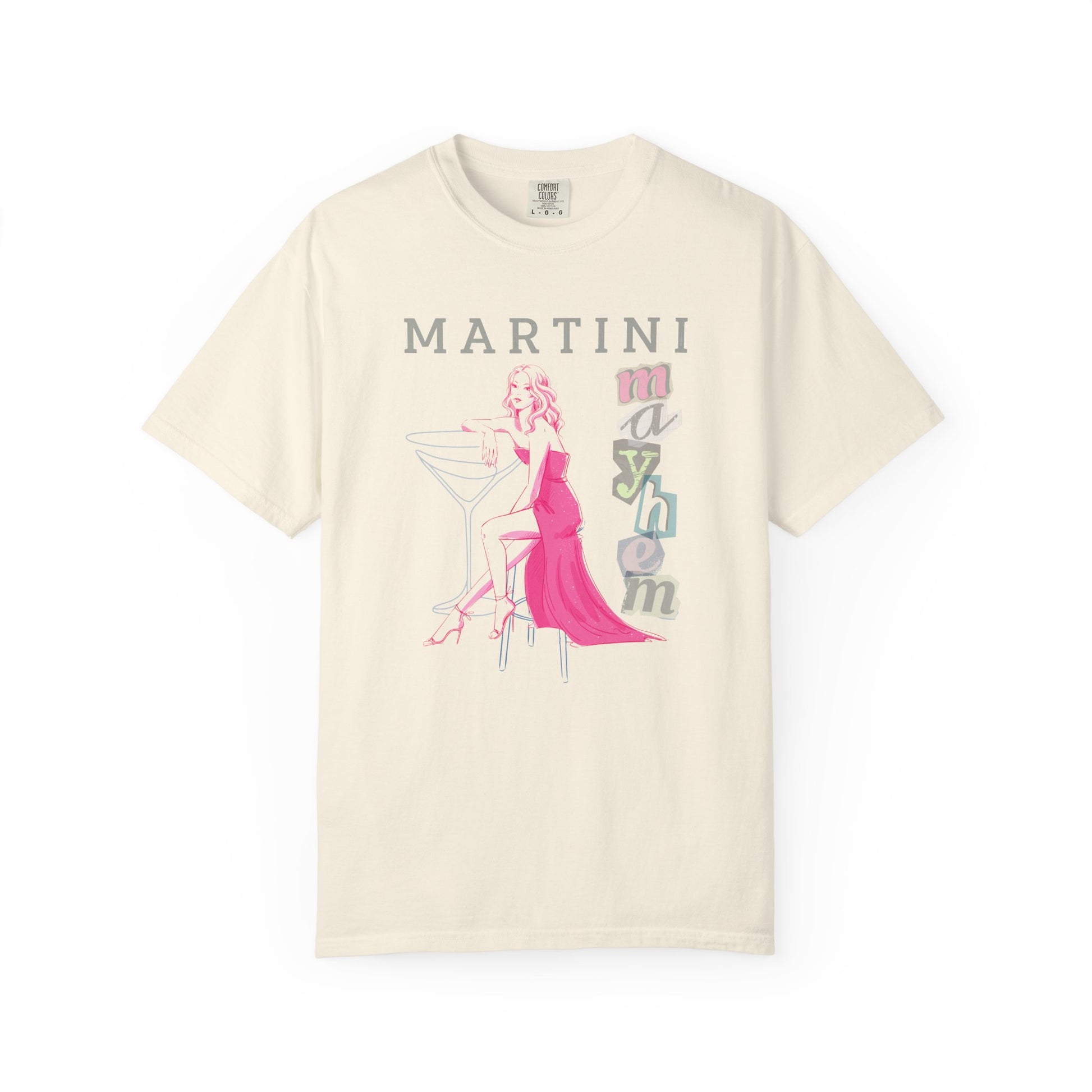 Bring the sass and sparkle with our Martini Mayhem t-shirt – the perfect retro vibe for the fun-loving, cocktail-sipping queen in your life. Featuring a glamorous illustrated woman in a pink gown lounging beside an oversized martini glass, this vintage-inspired 70s tee screams wine mom energy in the chicest way.